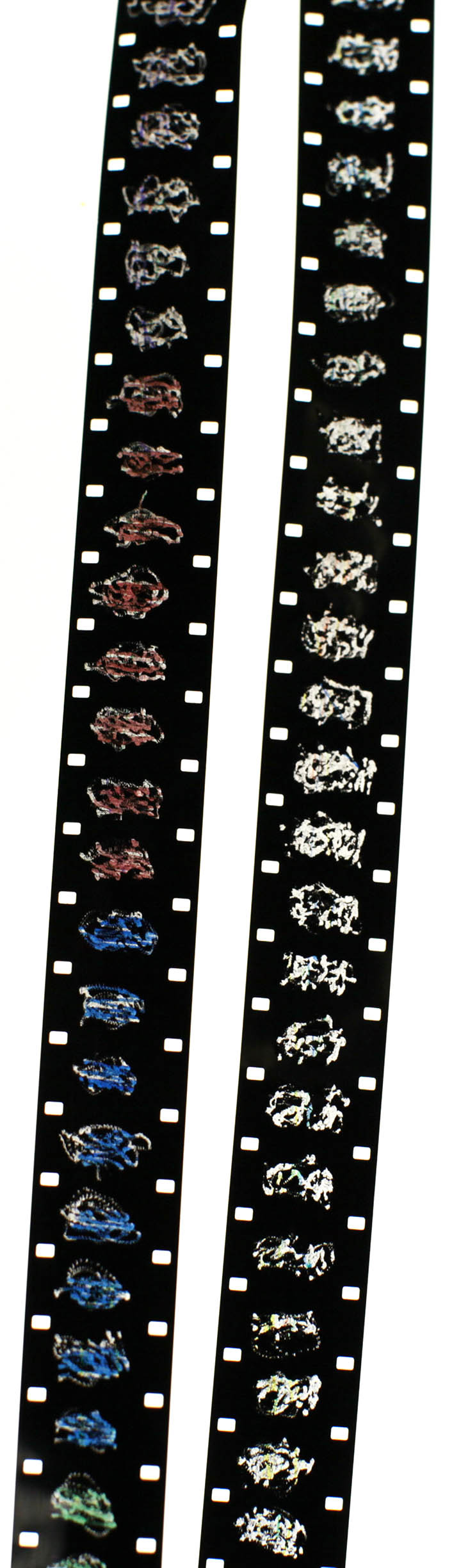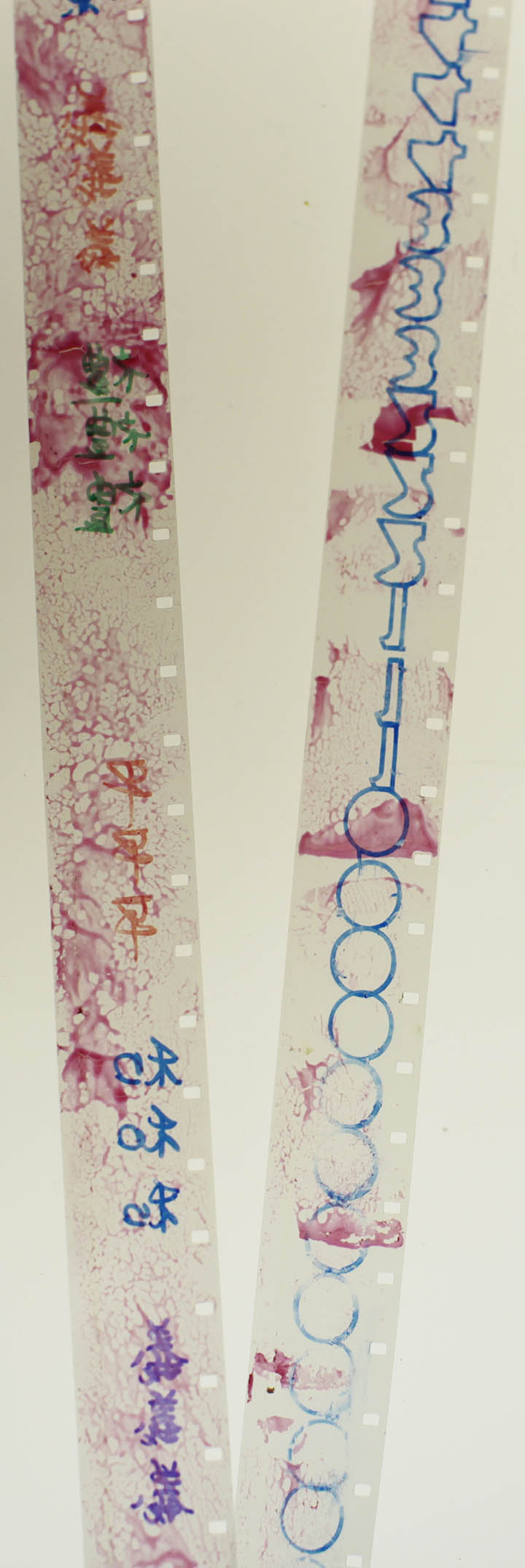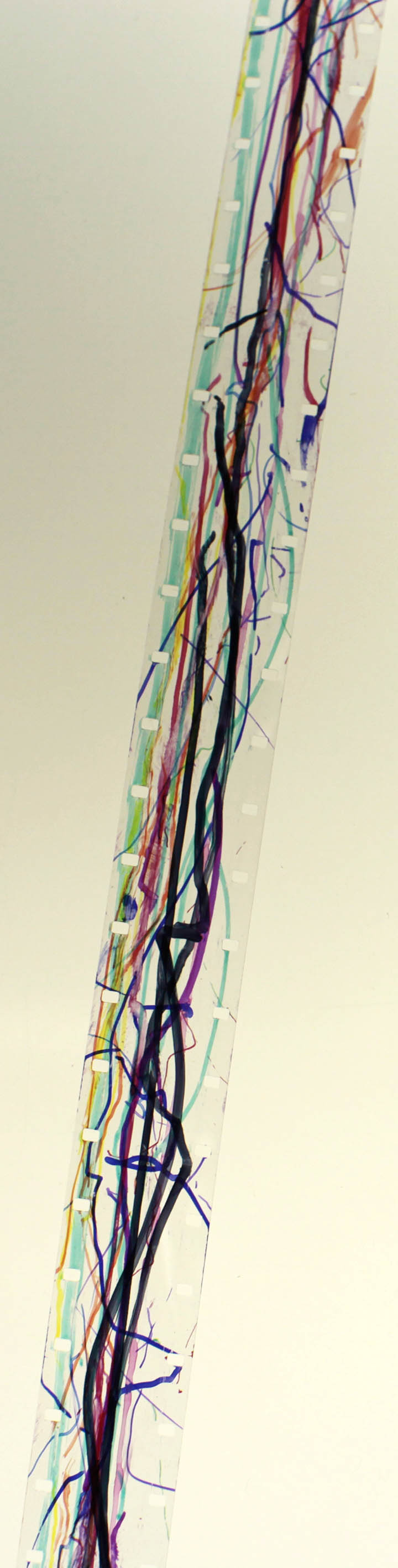 16mm film, red ink, sharpies, hand drill, Elmo