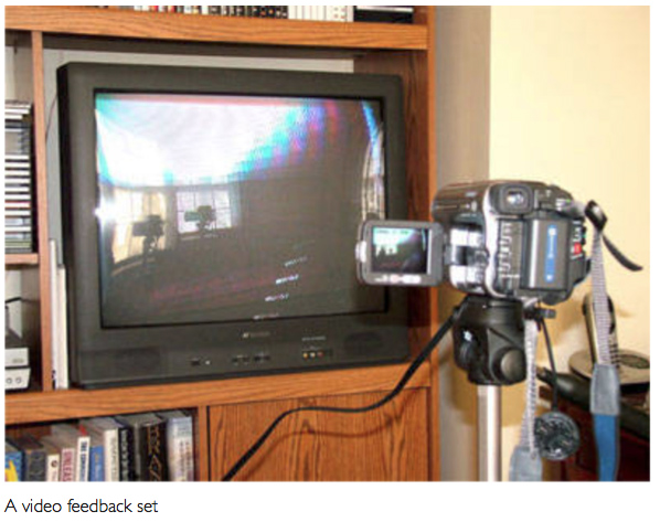 Briefly, video feedback is made by a video camera and a monitor. The video camera out- put the signal to the monitor, and meanwhile, video camera shoot the scene from moni- tor. As a result, it makes a loop, and when the camera zooms in, zooms out or do other movement (still shoot on monitor,) monitor can generate organic patterns. In the late 80s, many music bands such as Queens used this technique to make their music video.