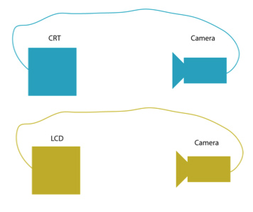I use both LCD and CRT monitor to generate video feedback for my work. The result from LCD and CRT are quite different. In my opinion, CRT can generate rich color, and the color tone of LCD is pretty cold. Therefore, I use part footage from CRT, and part footage from LCD in one video to fit the theme "interruption."