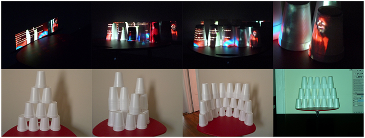 First, I arrange Styrofoam cups in different shape as a "sculpture," and then I project my computer screen on those cups and running Photoshop to make mask for each cup. Next, I import those mask into After Effects to get the raw video footage. Finally, I project the video on the cups.
